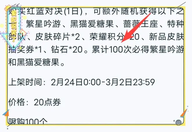 我们来看一下官方公告里面的原话,累计100次必得繁星吟游和黑猫爱糖果这两款皮肤。