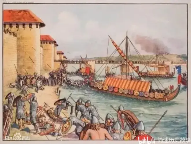 (一)胖子查理为了一统加洛林王朝的江山而挥师南下进攻富庶的意大利地区,然而他的大军开拔不久蓄谋已久的维京人便从海上杀到,这3万名蓄势待发的海盗驾驶着吃水极浅的划桨长船顺着塞纳河从大西洋海岸向东劫掠,最终目的地是位于河流上游的最富裕地区。但他们必须先拔出几座横跨在河流上的木桥,木桥连接着的便是胖子查理的首都巴黎。797年维京人首次入侵查理大帝统治下的加洛林帝国,当时加洛林帝国在查理大帝的统治下繁荣富强,维京人的入侵很快就被击退。到了查理大帝之子路易一世时期虽然其击败维京人的大部分入侵,但维京人的入侵越来越频繁且规模也越来越大。834年维京人抢劫帝国的金融商业中心多雷斯港,并沿着塞纳河北上劫掠沿途的鲁昂等地。路易一世去世后帝国被一分为三,形成后来德意志、法兰西和意大利三国的雏形。加洛林王朝从此开始分裂,并且一点点的衰落下去,这为维京人更进一步入侵提供了契机。随着加洛林王朝的分裂维京人于公元836年入侵安特卫普,841年掠夺鲁昂。845年维京人在拉格纳·洛德布洛克率领下攻占巴黎并大肆掠夺,西法兰克王国被迫求和,并且缴纳价值为7000里弗尔的丹麦金才让维京人离开。然而这只是个开始,法兰克人还要在以后的日子里向维京人再缴纳12次的巨额丹麦金。864年在西法兰克国王秃头查理命令下巴黎建起两座横跨塞纳河、另一侧位于西岱岛的桥梁。