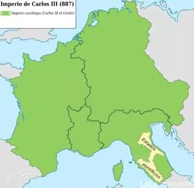 (三)876年日耳曼人路易死后他的三个儿子瓜分东法兰克王国,胖子查理继承士瓦本(阿拉曼尼亚)。879年胖子查理从他的哥哥卡洛曼手中继承意大利王国,881年由教皇约翰八世加冕胖子查为“罗马人的皇帝”,次年他又继承他另一个哥哥青年路易的萨克森和巴伐利亚,至此又统一东法兰克王国。884年胖子查理的侄子西法兰克国王卡洛曼二世去世,由于另一个侄子查理三世(糊涂查理)年幼他又当上西法兰克国王,因此他完成法兰克帝国自签订《凡尔登条约》以来的又一次统一。虽然胖子查理又一次统一法兰克王国,然而他的统治又是非常虚弱的,况且维京人多次袭扰他的帝国。