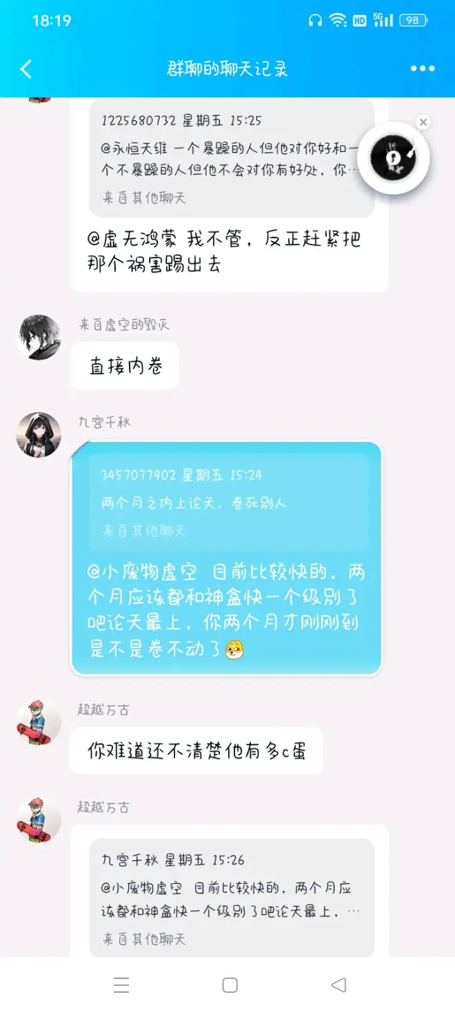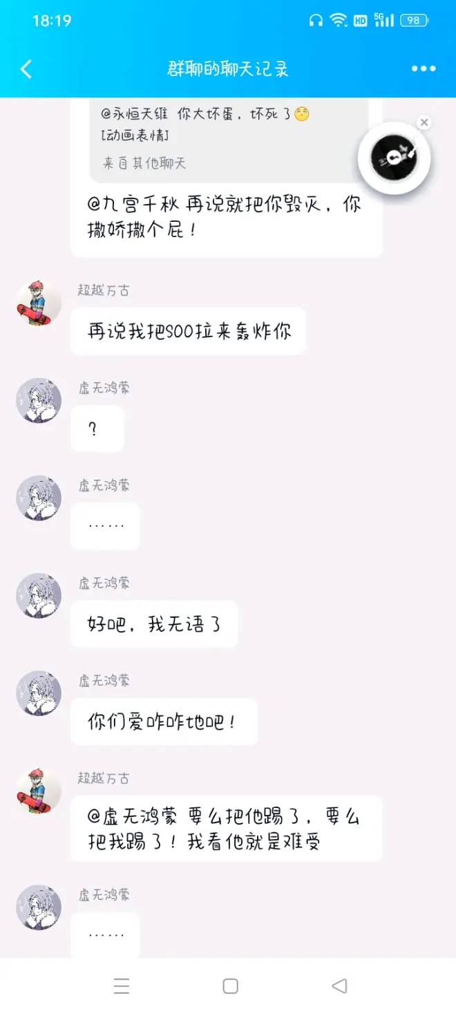可以看的出来那个叫九宫千秋的人在别人吵架的时候一直在那里恶心人😇,先说好别以为他是什么美女,人家是个男的而且不是个什么好东西 然后这个超越万古【也叫永恒】是这个虚无鸿蒙之前的好朋友【为什么说之前呢,因为已经绝交了】他劝告不要把这种垃圾留在群里但是人家不听啊,反而把一直支持他的超越万古给踢了,完事后还是一直护着这个垃圾