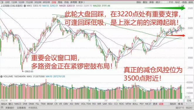 正如今天早上盘前直播讲到,大盘短线如果今天不能重上3300点,短线甚至可回踩到3220点附近,踩到这里都没有走坏,我认为可逢回踩低吸,这次回踩是重要会议结束之前,大盘起跳之前的深蹲!到下周会议结束,政策支持力度和方向落地,资金开始结束观望,布局主线,则是跳起时机!