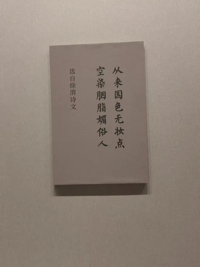 馆内没有禁止拍照,这是每个人的自由,只不过有趣的是,正对着我的墙壁上有一句徐渭的诗,讲的是水墨牡丹。