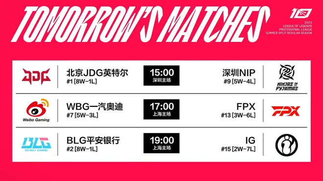 按照夏季赛赛程,6月27日继续安排了三场BO3,分别由JDG对阵NIP,WBG迎战FPX,以及BLG大战iG三场比赛。坦率地讲,这三场比赛,如果不出意外的话,基本上都是一面倒的比赛。