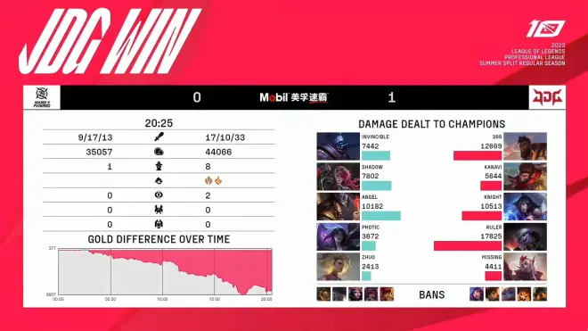 第二局比赛,简直就是首局的复刻版,都是JDG一路碾压,NIP毫无还手之力。所不同的是,第一局NIP还拿了一座防御塔,避免了零龙塔的尴尬,而第二局则是干脆连一座塔都没拿,直接被打成了零龙塔人机局。