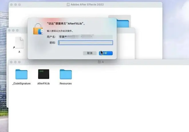8,把文件夹(AE2022激活)里面的文件夹(AfterFXLib)拖到已经打开的文件夹(A)里面