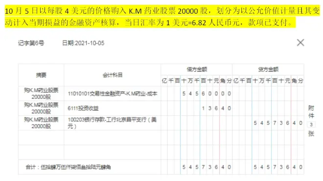 6、购K.M药业股票20000股