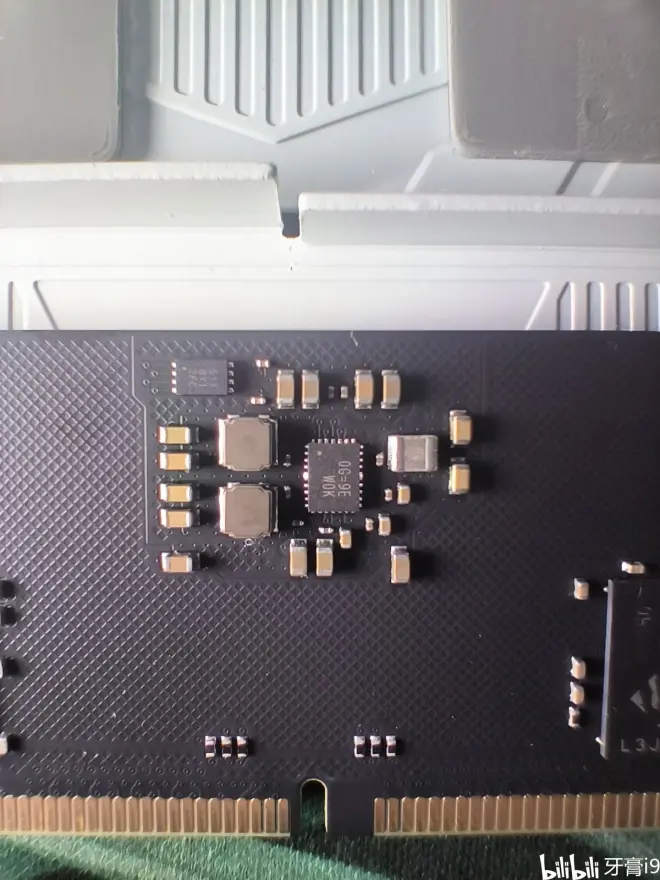 到手了先开马甲看一下,pcb布局上与常规16G内存无异,依然是单面8颗粒。颗粒上打了spectek的标,丝印代码为PT040,查询美光官网,确认这是一款单颗3GB的颗粒。