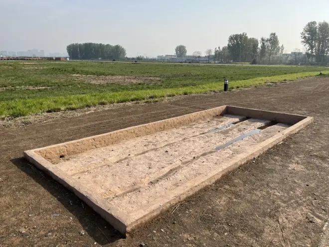 回到“最早的十字路口”,这里是宫城的东北角。在这里出土的大型建筑基址被命名为“二号宫殿”。二里头城墙、地基的夯土都使用轻体模壳进行了覆盖式保护,一定程度还原历史外貌的同时对遗址进行遮蔽,避免了风吹雨淋,有需要时移开模壳即可后续挖掘。也就是说,露在外面的并不是考古开挖面,实际开挖面在此之下几十厘米至两米多不等。