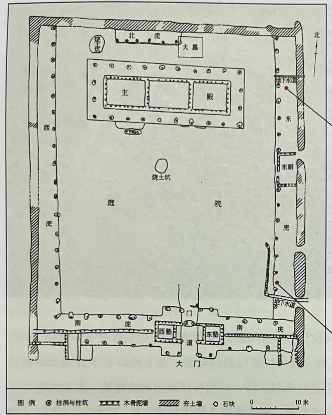 对二里头的研究很大程度上是考古挖掘基础上的想象,看一下《最早的中国》中,基于墙基、柱脚等平面布置对二号宫殿的复原图。这是一座占地面积4000平方米的院落,推定为祭祀类建筑,有明显的中轴线。
