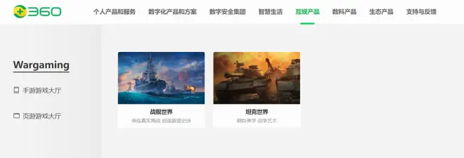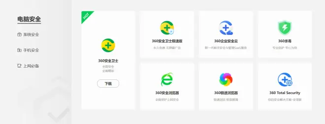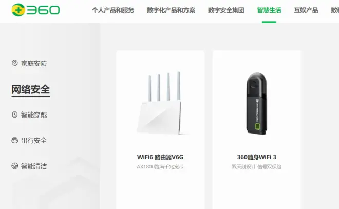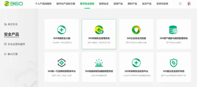 新增360企业安全云顶部宣传链接。原“个人软件和服务”tab更名为“个人产品和服务”tab,原“企业软件和服务”tab更名为“数字化产品和方案”tab,原“智能硬件”tab更名为“智慧生活”tab,原“金融数科”tab更名为“数科产品”tab。