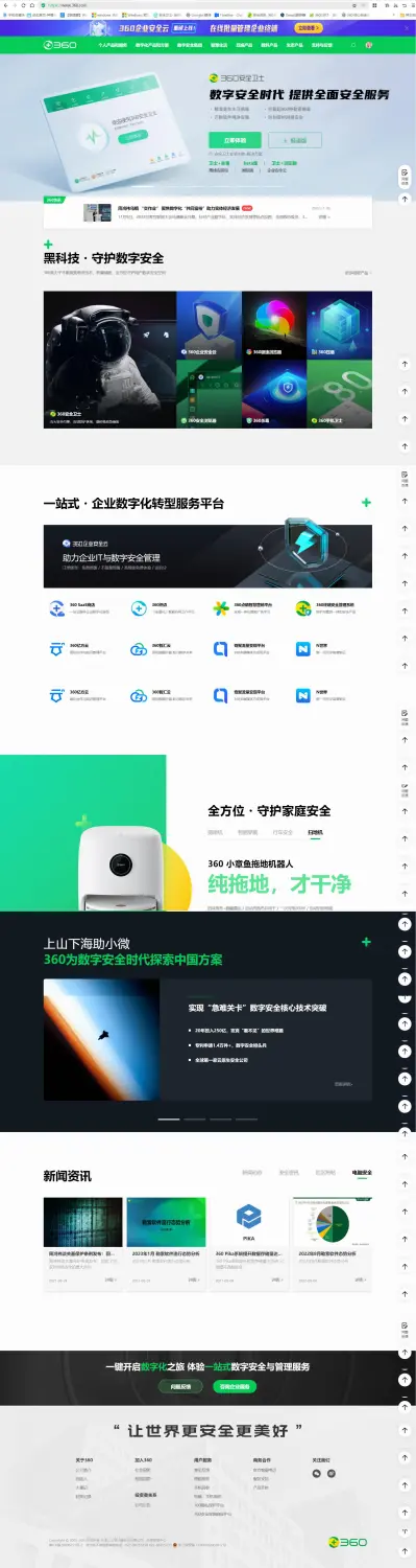 更换360公司价值理念slogan。调整slogan字形和字体。(可能是360守护体)由“不断创造黑科技,做全方位守护者”变为“让世界更安全,更美好”。微调一些服务链接顺序。删除一些服务链接。优化了“回到顶部”按钮。
