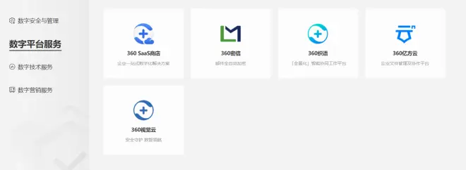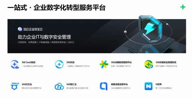 新增360企业数字化转型服务平台。融合360企业服务和360数字安全的服务。突出360Sass化安全服务-360企业安全云。