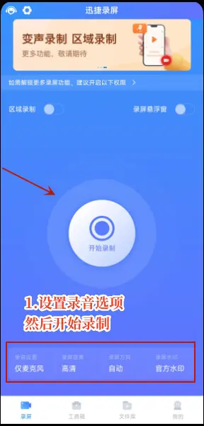 第一步:我们先在手机上下载这款录屏工具,然后打开它,想要录制视频,先来到录屏页面。在开始录屏前,选择好录音设置、录屏效果、录屏方向等。