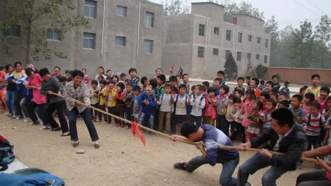 (2007年洪庙小学师生在操场上举行拔河比赛情景)