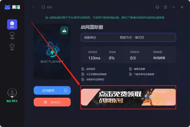 如果感觉官 网注册麻烦的玩家可以通过暴喵加速界面免 费领取