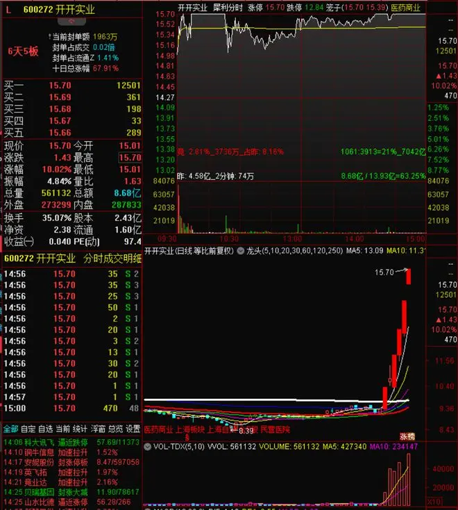3连板冲击4连板,只有一个开开实业,医疗医药方向,全资子公司上海雷允上药业西区有限公司稳步推进区域化SPD项目。这走势堪比前任4连板的塞力医疗了。(烂板了,35%的换手率)