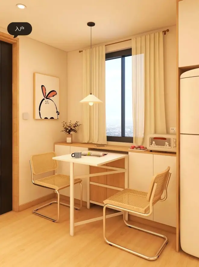 考虑到入户过道狭窄的情况,特意设计的餐桌是可折叠式的。