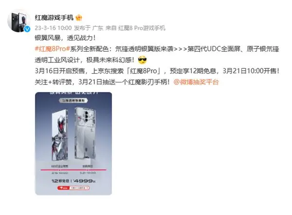 红魔8 Pro氘锋透明银翼版的12+256GB版本首发价4999元,现已开启预售。