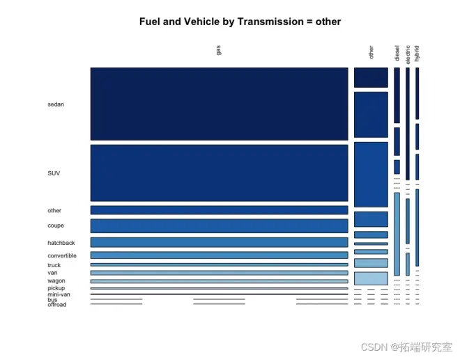 我们看到自动档 fuel == "gas"在所有类型的汽车中最常见,其次是手动。在后轮驱动车辆中,手动档比例确实高于轿跑车和敞篷车的其他车型,这是有道理的,因为轿跑车和敞篷车往往是跑车。在四轮驱动中,越野车比例更高。