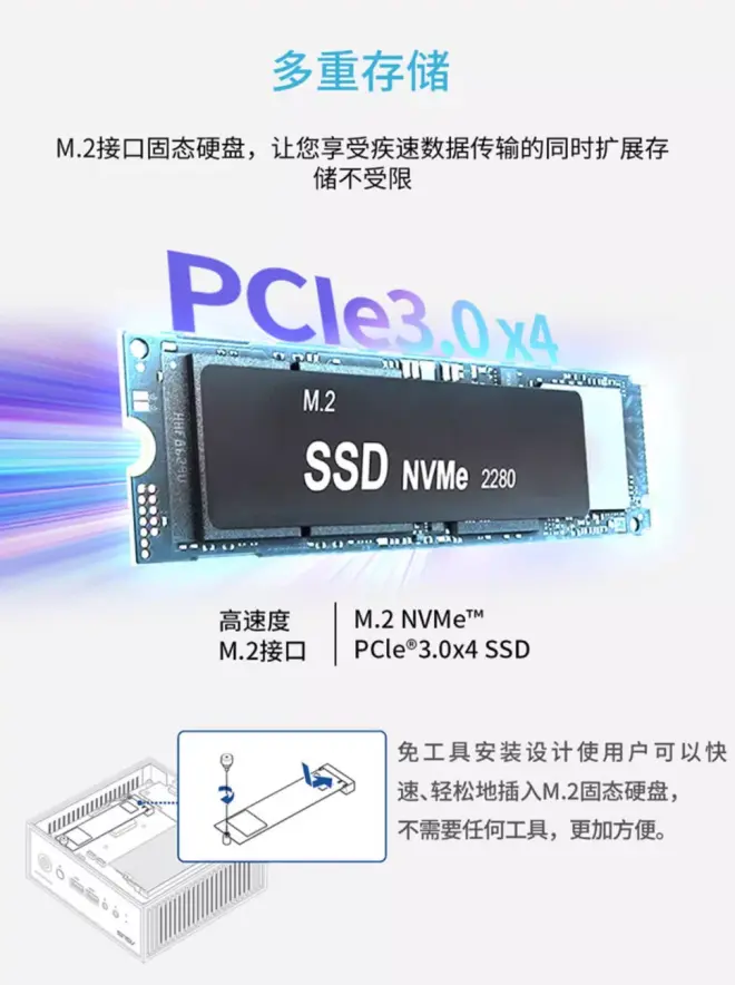 该产品内置1个DDR4内存插槽,最大支持16GB容量,内置1个免工具安装的M.2插槽,无线网卡型号则是英特尔AX201。