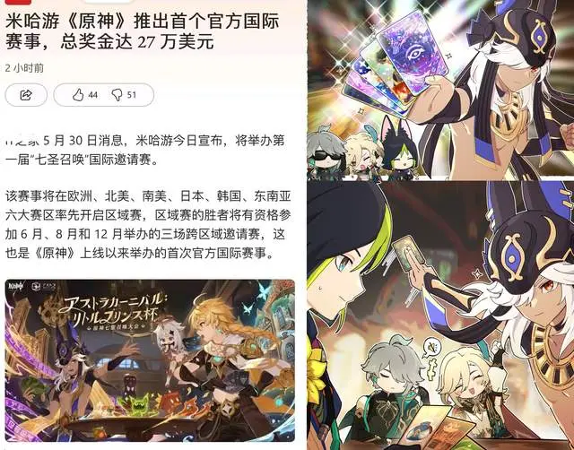 根据可靠消息,首届”七圣召唤"国际邀请赛即将开启,共有6个地区,奖金共有27万美元,也是原神上线以来举办的首次官方国际赛事,众所周知米桑在游戏外的一切都很大方,只要他愿意搞多少奖金都正常,这也是宣发的一部分,从此也能看得出老米对七圣召唤非常重视!