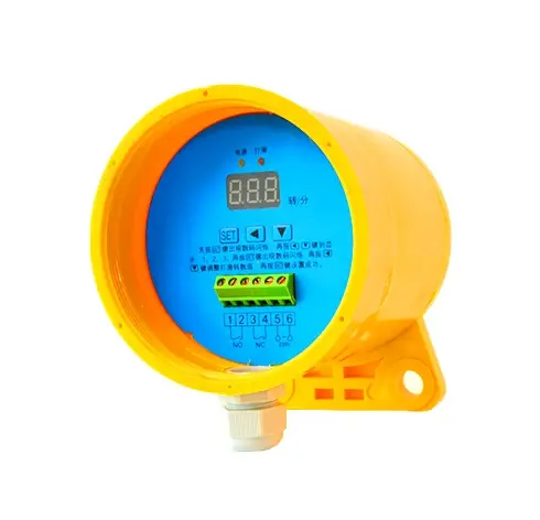 速度检测器,(又名打滑开关、欠速开关、低速开关、打滑检测装置),对皮带打滑、皮带断裂、卡转、慢转、动轴剪切和过载、传动链 ( 带 ) 脱落等机械故障能及时处理,起到保护设备的作用;用于皮带输送机、提升机、螺旋输送机、研磨机、破碎机、泵、离心干火机、搅拌机和除尘器等转动设备。