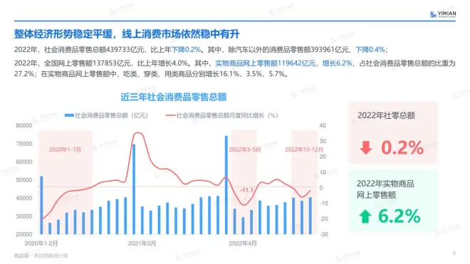 2022年,社会消费品零售总额4397 33亿2元,比上年下降0. 2%。其中,除汽车以外的消费品零售额393961亿元,下降0. 4%; 2022年,全国网上零售额137 853亿元,比上年增长4.0%。其中,实物商品网上零售额1196421亿元,增长6.2%,占社会消费品零售总额的比重为 27.2%;在实物商品网上零售额中,吃类、穿类、用类商品分别增长16.1%、3.5%、5.7%。