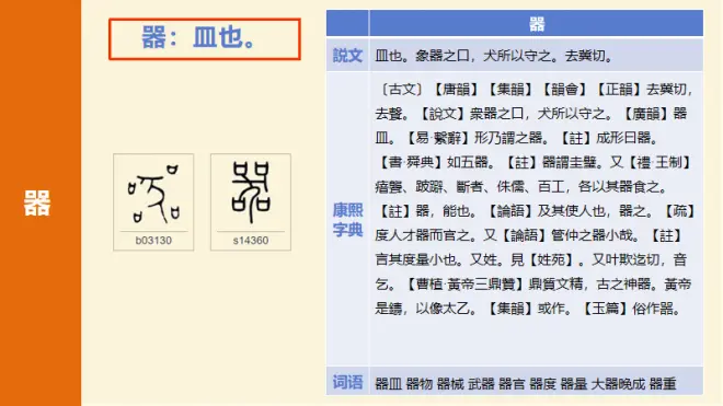 説文解字肆利用文物、甲骨文、金文、説文解字、康熙字典、常用词语等材料考证文字本义。工具包括:swjzs.net, 小学堂(https://xiaoxue.iis.sinica.edu.tw/),説文解字检索系统(北師大),先周考古文化数据库(豆瓣相册)。