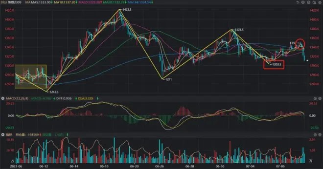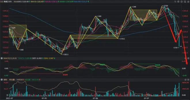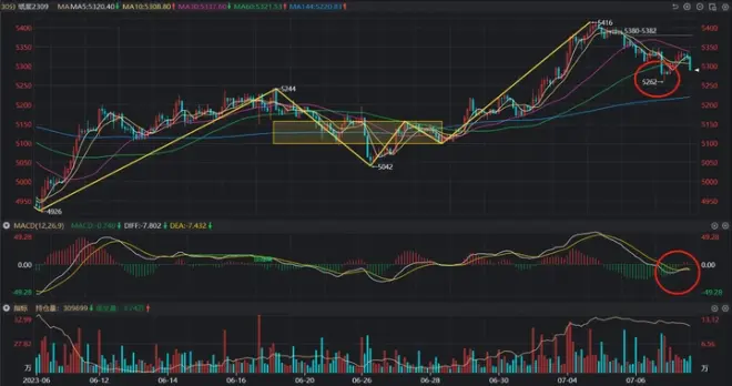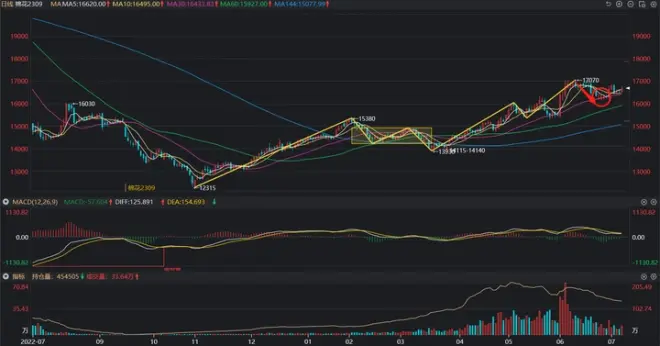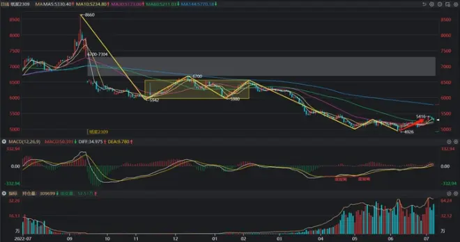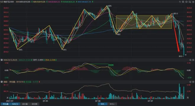 棕榈油今日收阴,日线延续一笔上对待,走的有点难受,同时我也处在其中,相当难受,内部结构上,30分钟类破位后的一笔下,由于特征序列并未回补,加上个人偏向看多,所以就没考虑离场,昨晚、今天的操作有点上头,复盘也没完全看懂自己干什么,当下冷静下来后,正在规划后续的操作,30分钟当前这笔下力度是偏弱的,夜盘观察次级别能否确认分型,之后看一笔反弹。再看5分钟图,同样也是存在特征序列缺口,夜盘看两个位置,后续够笔的情况下如果上破红圈,则是类破位,观察后面能否回补特征序列缺口,就继续坚持,如果夜盘下破红色方框,那就意味着空头还未彻底结束,减仓或撤离离场,认怂;