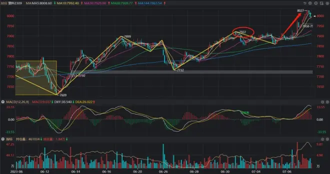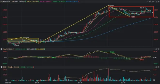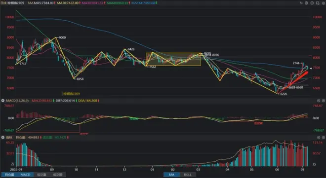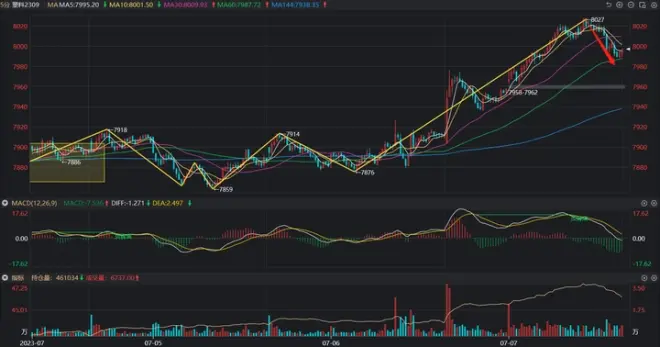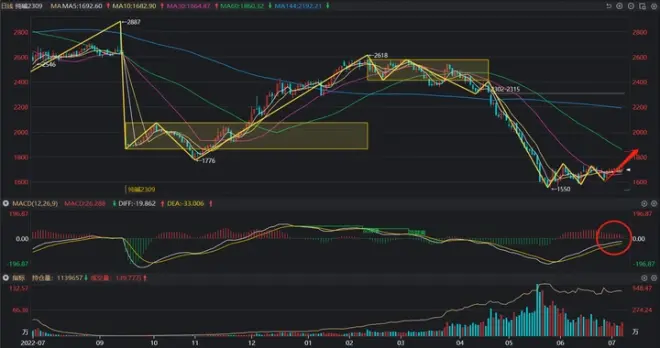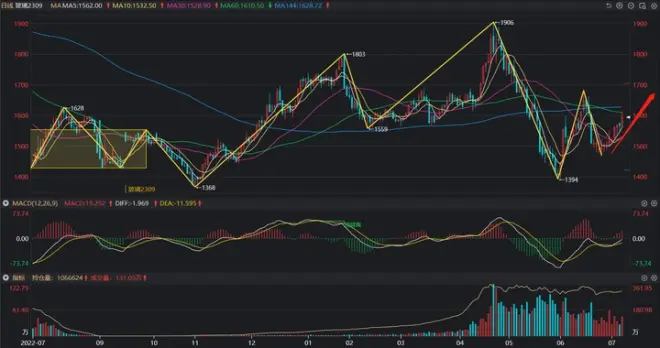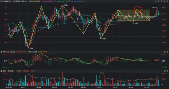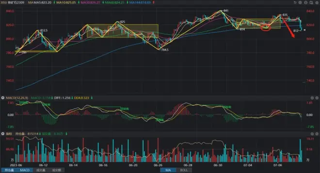 纸浆今日收阴,日线一笔反弹对待,从K线形态上,有点上涨三兵的意思,内部结构上,30分钟一笔下红圈处分型还未确认,不过MACD下穿了零轴,如果这里3买能确认,那么大概率还要构建第二个中枢。再看5分钟图,夜盘红圈处上破,则30分钟3买确认,如果继续下探,那么意味着30分钟的3买就还早;