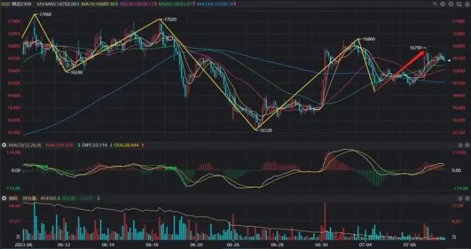 棉花今日收锤子阳线,日线等待一笔下结束可以焦虑介入,内部结构上,30分钟一笔下结束开启一笔反弹,目前还是在中枢震荡中,看不出具体的走向,操作上分笔参与为宜。再看5分钟图,一笔反弹力度偏弱,夜盘观察之后的一笔下是否出3买;