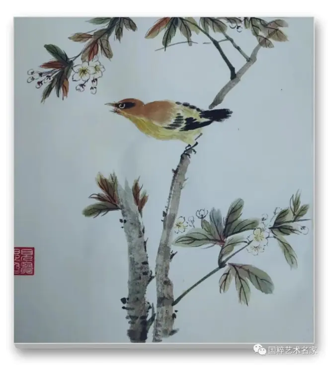 展卷细品,李建彪先生笔下的花鸟,取象于平中见奇,淡中见雅,运用条幅与方形的构图,使其韵味无穷。看他的作画,很强烈的感觉到用线的流畅、柔和、霸气和俊美,时时透出一股灵气。在花与鸟之间,点缀着或黄、或青、或深、或淡的枝叶,在静与动之间,呈现出一片平静祥和的气氛。他笔下的花鸟可谓是形神兼备,栩栩如生,构思巧妙。