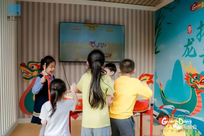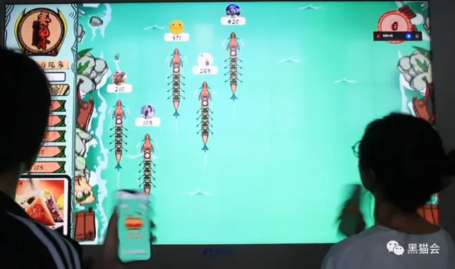 玩法介绍:玩家敲击鼓面开始游戏,游戏开始后,每敲击一下,龙舟会前进一点。因为是做的软件识别鼓的震动,所以玩家敲击鼓面的速度会直接影响对应龙舟的速度。左右玩家竞赛pk,看谁的龙舟更快到达终点。