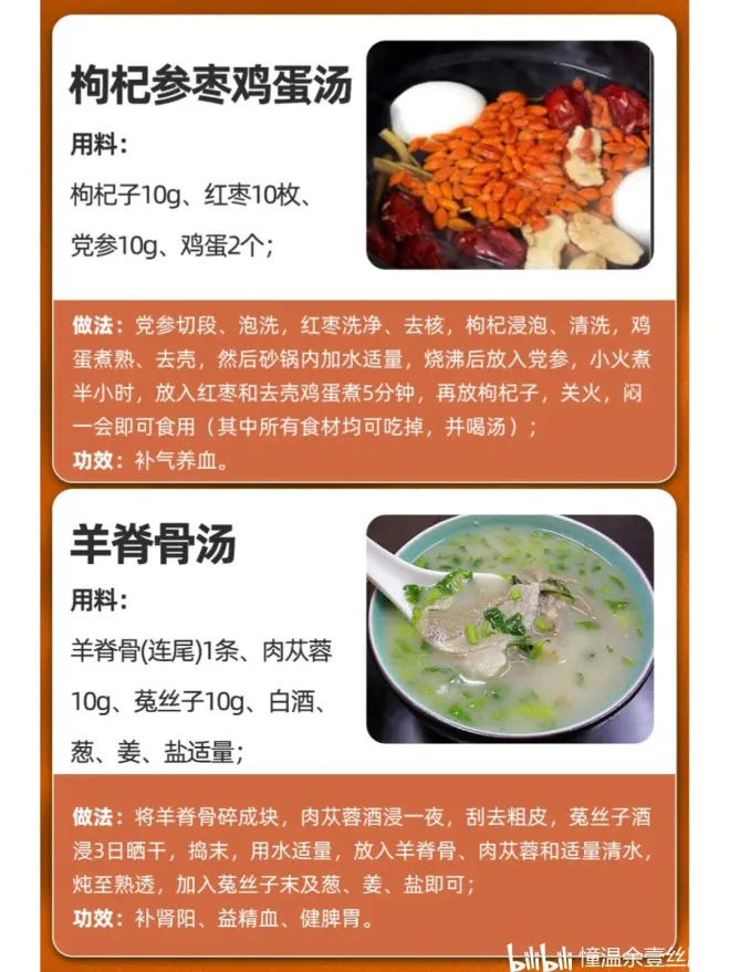 做法:党参切段、泡洗,红枣洗净、去核,枸杞浸泡、清洗,鸡蛋煮熟、去壳,然后砂锅内加水适量,烧沸后放入党参,小火煮半小时,放入红枣和去壳鸡蛋煮5分钟,再放枸杞子,关火,闷一会即可食用(其中所有食材均可吃掉,并喝汤);