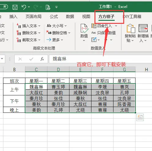 1如下图是某单位值班表,现在我们想要提取出值班表中所有值班人员不重复名单。