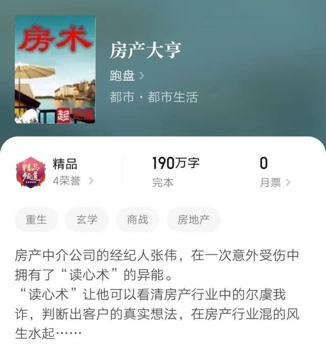 这个题材现在已经很少有人写了,即使有涉及的,也多是在都市重生文里顺带写了。专门写房地产小说的,还是非常少的。在中国,房子是刚需,说多了都是泪。