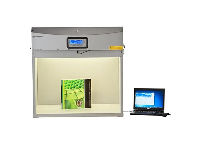 如果人能够在相应的标准光源下去看这些颜色,那么可以保证人看到的颜色和测色仪测量值相同,因为两者使用了同一光源,同一物体,观察的“眼睛”又几乎一样。问题来了,标准光源事实上是无法获得的,因为那只是一串光谱功率分布的数字而已,实际生活中,并没有任何灯具能够生成标准光源。最接近标准光源的东西是对色灯箱,类似下图。