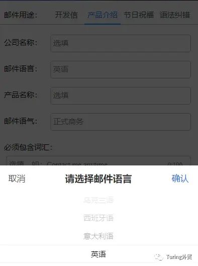 「AI开发信」可以帮助您生成邮件开发信,无需自己手写。您只需输入公司名称、选择邮件语言、产品名称、邮件语气等信息,就可以快速生成一篇邮件开发信。