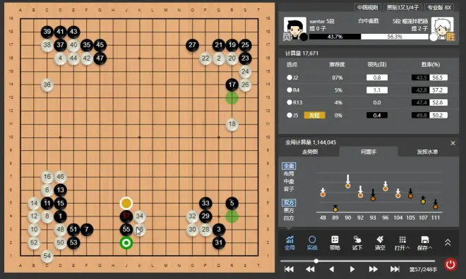 46、48仍应安定下面。55应该二路漏进去,实战俗手把白棋撞厚了。