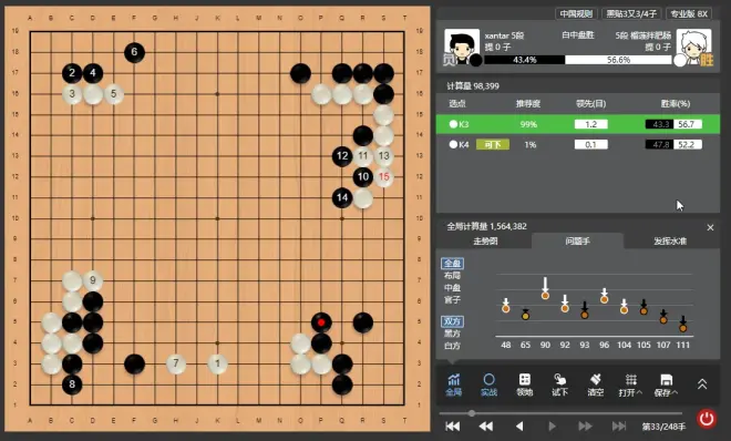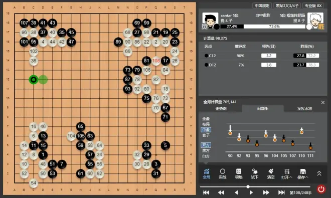 109、111都应该打入白左边,AI说攻击白左上互破比互围好。后面AI居然已经觉得没机会了。围上面围中间救左下四子全走到才够。