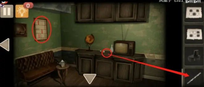 7、返回向右来到805客厅,墙上画框得到书架线索,电视机旁边得到钻头,