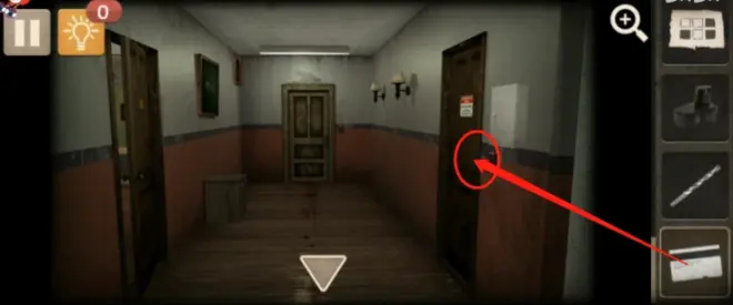 13、回到走廊,用把手打开左侧地上柜子,得到密码纸4。
