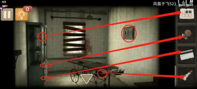 11、探索手术室,柜子上层得到密码纸3,抽屉1得到把手,抽屉3需要解题,中间手术架上得到小钥匙,墙上解刨图后面发现九宫密码锁。