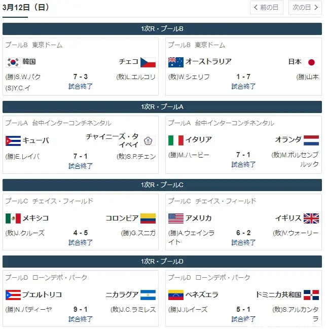 墨西哥4:5哥伦比亚,美国6:2英国;波多黎各9:1尼加拉瓜,委内瑞拉5:1多米尼加
