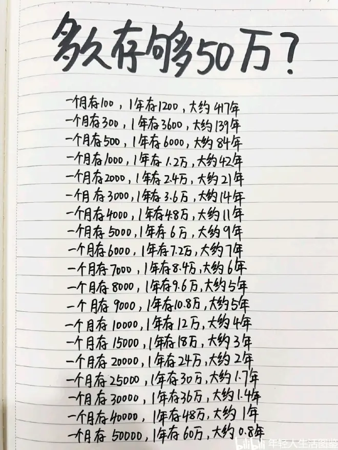 存入50万需要的时间取决于多种因素,如个人的收入水平、支出习惯、储蓄目标等。以下是一些可能的时间参考: 如果按照每月存入2万元,且每年存款利率为2%的情况下,50万需要存入25个月(约为2年)。 如果每月存入5000元,则需要存入100个月(约为8年)。 需要注意的是,以上计算是基于一些假设和理想情况,实际所需时间可能会因个人情况的不同而有所差异。此外,存款利率和存款时间也会影响最终的收益。 同时,存钱不仅仅是为了达到某个金额,更重要的是培养良好的储蓄习惯和财务管理能力,这对于未来的规划和应对可能出现的风险和挑战至关重要。