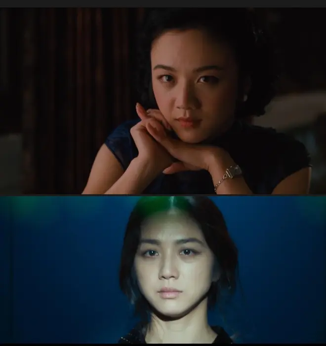 在现实中找不到存在意义的她,反而在麦太太这个身份里找到了自我,找到了爱。从汤唯在不同身份角色的表演就能看出,灰头土脸、目光呆滞的王佳芝和光彩照人、眼波流转的麦太太。她的幕后团队为她量身打造了一个蛇蝎美人的所有要素,金钱、华服、妆容、别墅、司机,这一切通往浮华戏台的门票,所需交换的代价则是她的贞操、情感乃至生命。
