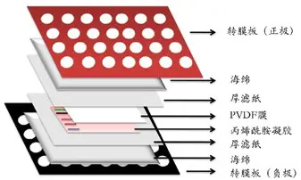 平放转膜转移槽,依次在黑色面叠放海绵,3张浸泡过的滤纸(按照滤纸的厚度进行增减),凝胶,PVDF膜(为了区分,可减角进行标识),每叠放一层,都需要赶走气泡,红面上叠放海绵,3张浸泡过的滤纸;