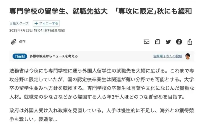 今年七月份,日本经济新闻报道,日本法务省表示在今年秋天会扩大在日本国内专门学校毕业的外国留学生就业范围。