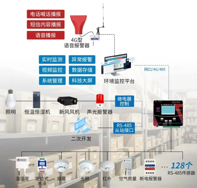 多功能数据采集主机具有2路继电器触点输出,能够外接声光报警器,用户可以提前为接入的环境监控传感器设置告警上下限阈值,当周围环境超过此阈值时,声光报警器会同步报警,引起现场工作人员的注意;也可以接各种被控设备,实现自动控制(在数据超限时控制)、定时控制、远程手动控制,节约人力,降低事故发生概率。