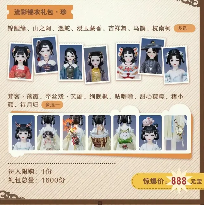 本次时装饰品包括锦鲤缘、山之阿、遇蛇、庭燎绰、换流年琵琶语、对竹赋、风花雪月、宝檀金、御龙吟、莲花阮、朝凤、龙头三弦等等。每一件时装和饰品都经过精心制作,设计出众,具有不同的风格和特色,都是心动款。届时,大家可要选择你心仪的时装和饰品,展现个性魅力哦!